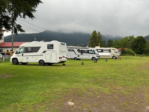 RVパークには、フルコンのADRIAソニックと見たことが無いような大型トラックベースのキャンピングカーが入っていた。雲が低く垂れこめ今にも降り出しそうだったが、雨はまだ降り出していなかった。