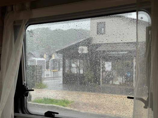 激しい雨の中、管理棟にゴミ捨てをお願いして、10時ちょうどにチェックアウトした。