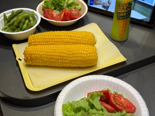 少し遅くなってしまったので、この後は高速道路を使って、18時40分に「道の駅おとふけ」に到着した。夕食は「道の駅えにわ」で買ってきた枝豆、恵味ゴールド、トマト、リーフレタスの地元づくし。